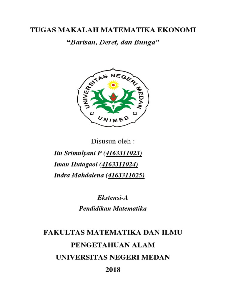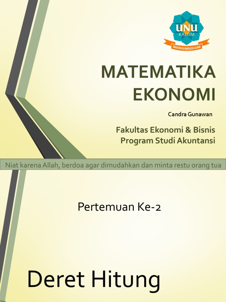 Barisan aritmetika definisi barisan aritmetika adalah suatu barisan bilangan yang selisih setiap dua suku berturutan selalu merupakan bilangan bilangan yang tetap tersebut disebut beda dan tetap (konstan). Deret dilihat dari jumlah suku deret dilihat dari segi pola perubahan bilangan pada suku deret berhingga deret hitung deret deret deret ukur deret tak terhingga deret harmoni 3 Matematika ekonomi iv matematika ekonomi identitas mata kuliah program studi : View matematika ekonomi.rtf from economic 09 at uin maulana malik ibrahim malang. Matemati ka ekonomi 1 deret dosen fitri yulianti, sp, msi.