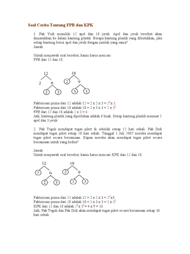 Faktor persekutuan terbesar atau yang disingkat fpb dalam bahasa inggris dikenal sebagai. Soal ulangan harian matematika materi fpb dan kpk kelas 4 terdiri dari materi faktor, faktor persekutuan, faktor persekutuan terbesar (fpb), kelipatan. Part 1menyelesaikan soal cerita, tentang fpb dan kpk. Sebelum menginjak ke contoh soal penyelesaian fpb dan kpk mari kita mengingat kembali mengenai bilangan prima dan faktorisasi prima. Dong di video kali ini kakak akan membagikan cara mudah dalam menentukan manakah soal fpb dan manakah soal kpk.